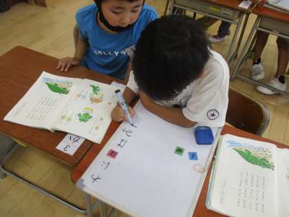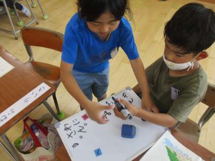 今日は、「〜は」「〜を」「〜へ」の文をペアの友達と考えました。どんな文にするか、楽しそうに話しながら書いていました。