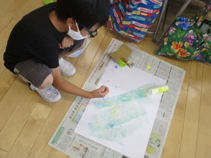 今日は、家から持ってきた様々な材料に絵の具をつけて、画用紙に形をうつしました。材料の準備、ありがとうございました。とても楽しそうに活動していました。片付けも、進んで取り組めました。