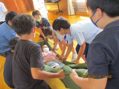 毛布を使った担架で人を運ぶ体験をしました。