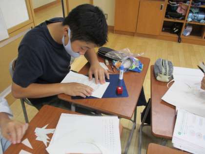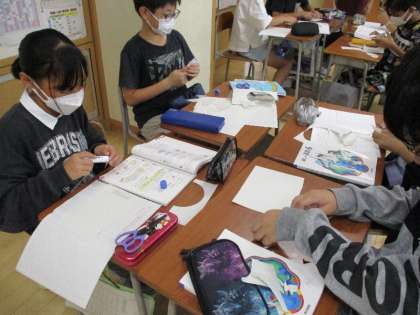 算数科では、「円の面積の求め方を考えよう」の学習をしています。今日は、円を等分して並べ替えた形から円の面積の公式を考えました。子供たちは、班の仲間と協力しながら、公式を出せるよう活動していました。