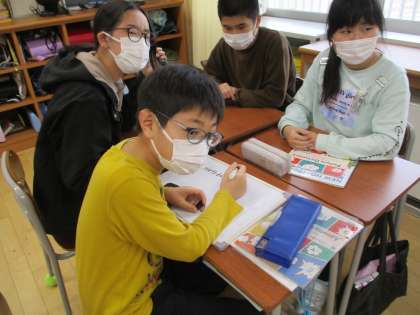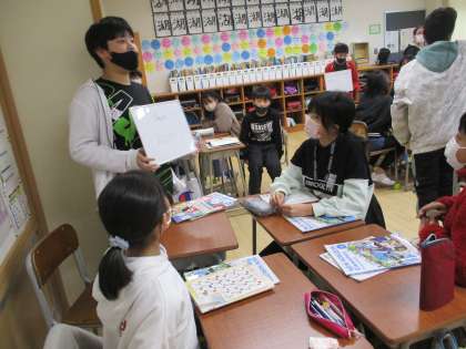 外国語では、学習のまとめとしてこれまで学習した質問に答えるゲームをしました。グループごとに質問に答えられると、ポイントがもらえます。しかし、選んだカードによってもらえるポイントが違います。ポイントの高いカードやマイナスポイント、他のグループと交換したり、もらったりできるカードなど、様々なカードがありました。子供たちは、何ポイントもらえるかどきどきしながら、ゲームを楽しみました。