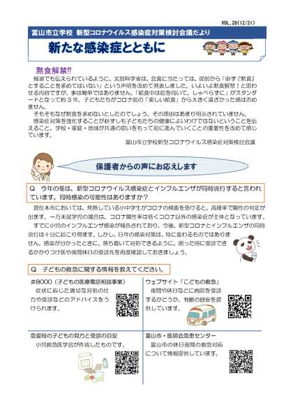 富山市立学校 新型コロナウイルス感染症対策検討会議だよりVOL.20 公開日 2022/12/22 更新日 2022/12/22 学校から 富山市立学校 新型コロナウイルス感染症対策検討会議だよりVOL.20