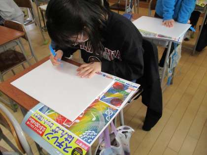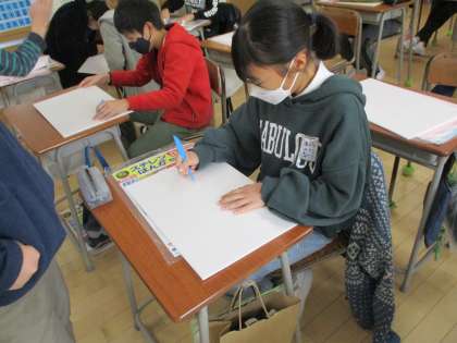 図画工作科では、「版で広がるわたしの思い」の学習をしています。スチレンペーパーにへらで跡をつけて模様を描きます。その模様を刷った後、スチレンペーパーを切り取りスタンプをつくり、模様の上からスタンプを押します。今日は、スチレンペーパーに思い思いの模様や絵をへらで跡をつけました。子供たちは、どんな作品になるか想像しながら、取り組んでいました。