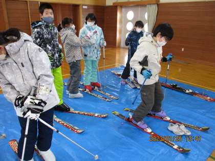 27日(金)に予定している4・5・6年生のスキー学習に向けて、体育館でスキーのフィッティングをしました。