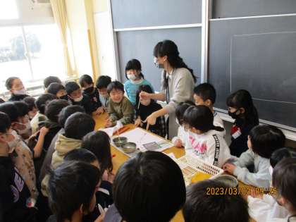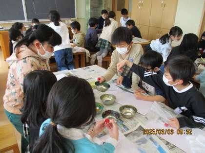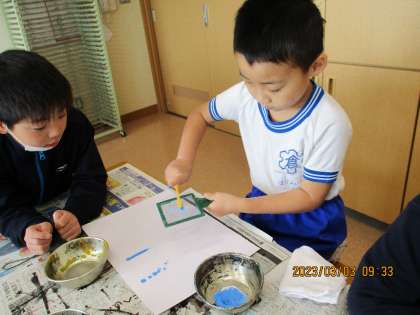 様々な道具を使って、3色の絵の具だけで、楽しい絵をかきました。
