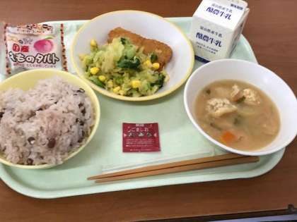 赤飯、ごましお、白玉汁、コーン和え、とんかつ、桃のタルト