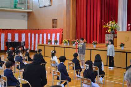 担任の先生から6年生の心構えについてお話がありました。 入学式では、児童代表の挨拶もあり、大役を果たしました。