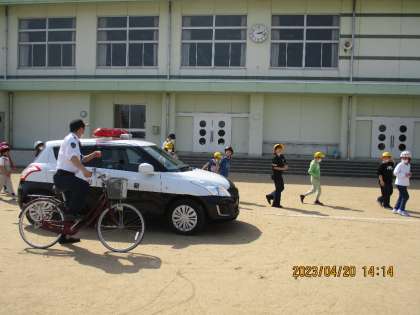 おまわりさんから、自転車に乗るときの注意点についてお話を聞き、実際に練習しました。