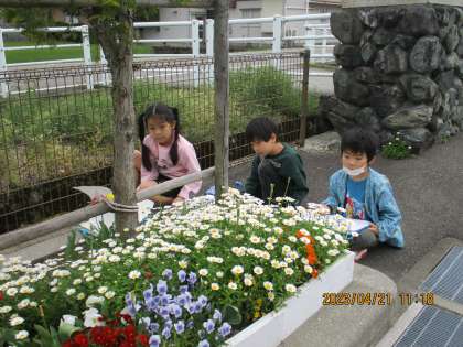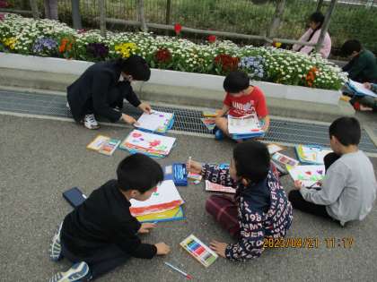 外に出て、チューリップのスケッチをしました。 クレヨンを使って、いろいろな色を混ぜ、花びら1枚1枚丁寧に書きました。