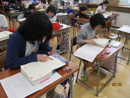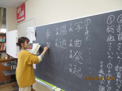 漢字辞書を使って、黒板に書かれた漢字を調べました。 音読み、訓読み、画数と、いろいろな調べ方を見つけました。