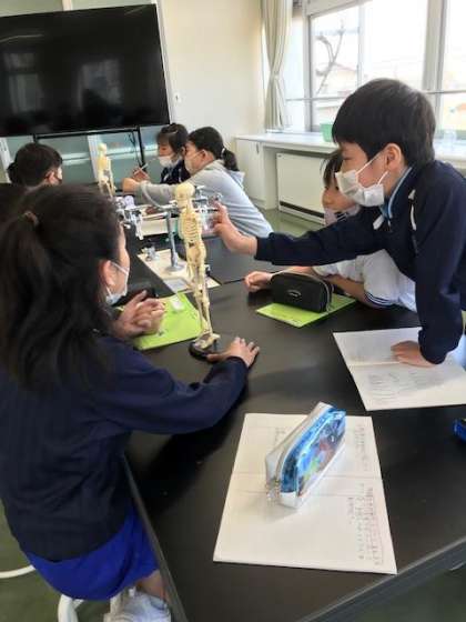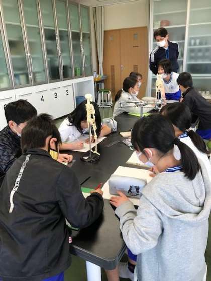 「理科室でがいこつが・・・」と、お化け話を連想したのか、はじめのうちは叫び声を上げていましたが、しばらくすると、すっかり落ち着き、模型をよく見たり、触ったりして骨のつくりを確かめていました。気づいたことはしっかりとノートにも書いて、さすがは4年生という様子でした。