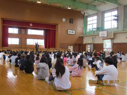 連休明け、全校の子供たちが体育館に集まり、校長先生のお話を聞きました。