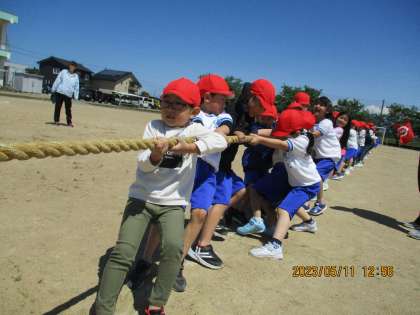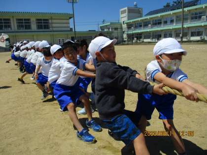 昼休みには、全校競技のつな引きの練習をしました。 綱を引く力強い声が、グランドいっぱいに響きました。