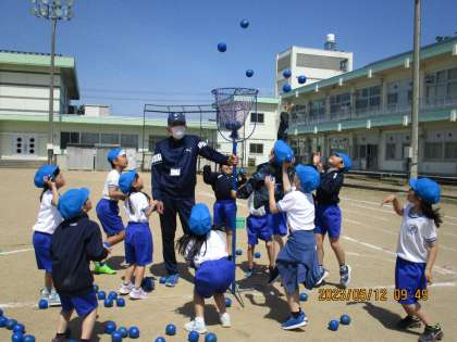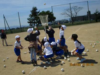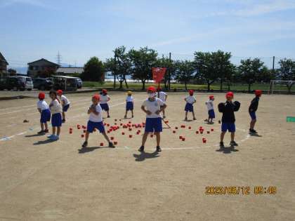 1・2年生合同で、運動会の低学年競技「チェッコリ玉入れ」の練習をしました。