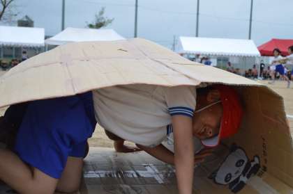 3・4年生合同競技のキャタピラボールHこびリレーです。