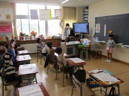 「いくつといくつで6?」をみんなで考えました? 友達が動かした算数ブロックは5です。残りいくつで6になるかな?
