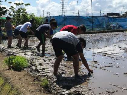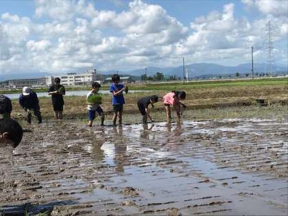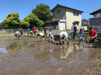 5月らしいさわやかな風の中、地域にある田んぼをお借りして、5年生が田植えに取り組みました。