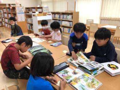 学校のまわりで見つけた生き物について、2年生が本で調べていました。