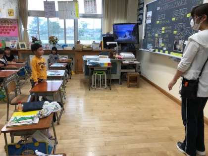 1年生が、昨日の学校たんけんで、見つけたものや見つけたことを紹介し合っていました。