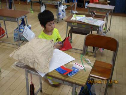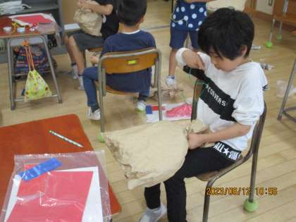 袋の中にたくさんの丸めた新聞紙を詰め込んでいます。 何ができあがるのかな? どの子もとても集中して取り組んでいました。