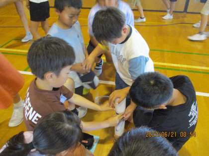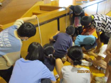 メジャーを使って、ステージの高さや、円柱の筒の周りの長さ、先生の周りの長さなどを測り、メモリを読む練習をしました。