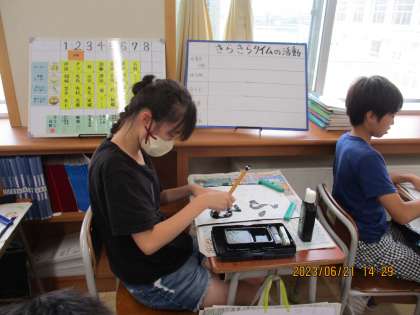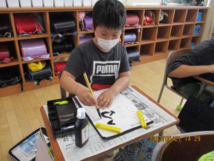 今日は「ふるさと」という字を書きました。 穂先を、次の画の始筆につなぐ気持ちで書くことを意識して練習しました。