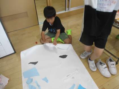 今日の図画工作では、紙をいろんな形にやぶいたりちぎったりしました。