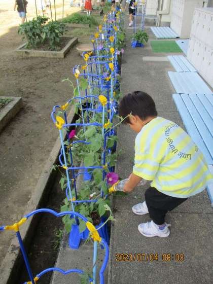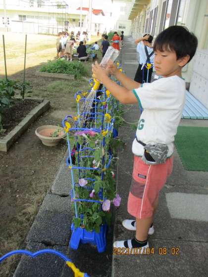 ランドセルの片づけが終わったら、アサガオの水やりです。