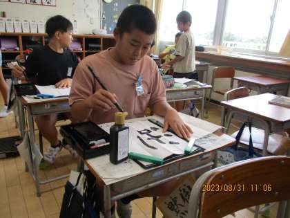 「湖」という漢字を毛筆で書きました。 3つの部分の組み立て方を考え、バランスよく書けるよう、集中して取り組みました。