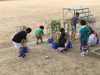 アサガオに種ができていて、1年生はたねの収穫に夢中です。