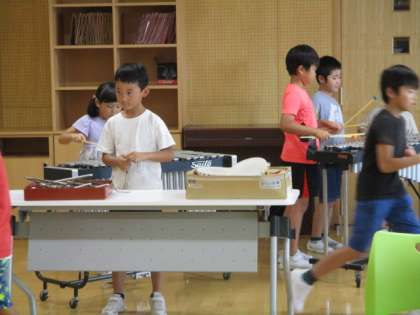 音楽の時間に、「虫のこえ」の歌に合わせて、虫のなき声に合うような楽器の音を探し、工夫して演奏しました。