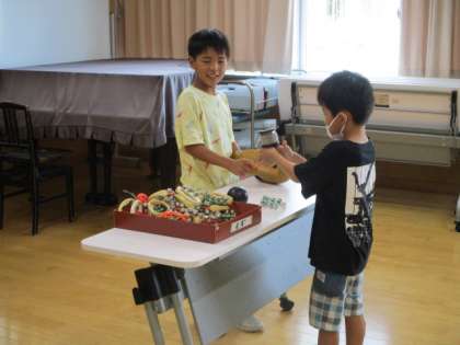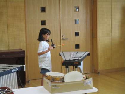 同じ楽器でも、演奏の仕方を工夫すると、全然違う音になります。「チョンチョンチョンチョン スイッチョン」には2つの楽器が必要だと2種類の楽器を持って歌に合わせる子もいました。