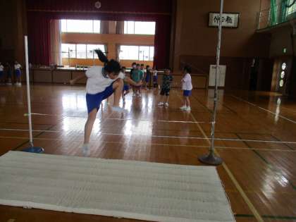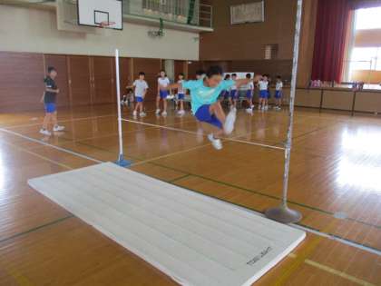 走り高跳びを練習しました。 自分の目標に合わせて、ゴムの高さを決めていきます。 声を掛け合いながら練習しています。
