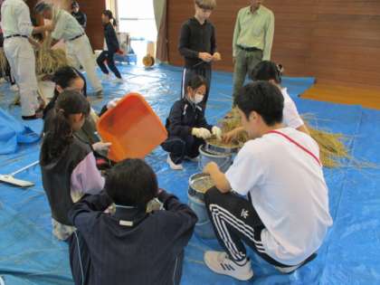 昔ながらの脱穀機を使い、稲わらからお米だけを取ります。