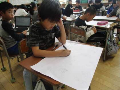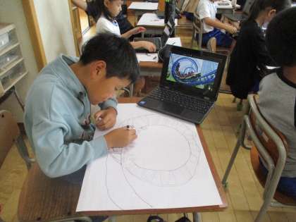 楽しかった思い出の絵の下書きをしています。 細かなところにもこだわりを持ってかいています。