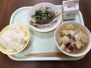 4時間目の合唱の練習が終わり、3年生の子が「おなかぺこぺこだー」と言いながら体育館から帰ってきました。「今日はさつま汁だよ」と伝えると、