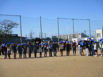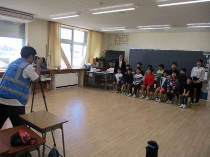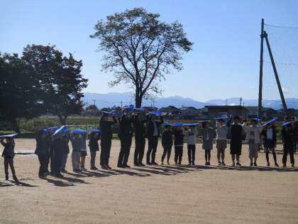 また、全校での集合写真、地域・保護者の方もいっしょにドローンでの航空写記念写真を撮影しました。ドローンが上空150mへ飛び立つときには、子供からも大人からも一斉に歓声があがりました。