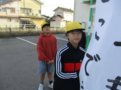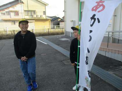 のぼり旗をもって玄関前に列をつくっているのは、「スマイル・ハッピー委員会」の5・6年生です。