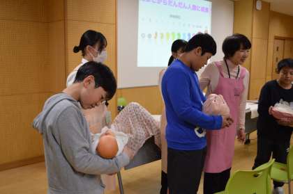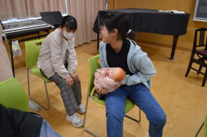 3か月、6か月、8か月の胎児人形や新生児人形を抱っこさせてもらうと、子供たちの表情もとても和らぎました。