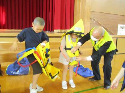 富山アラートライオンズクラブより、下学年の子供たちにライフジャケットを頂きました。