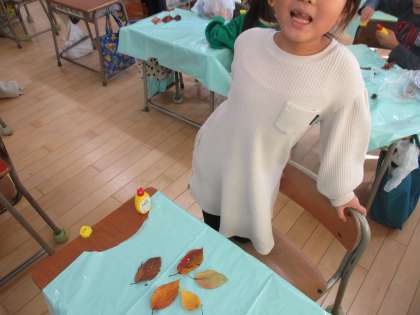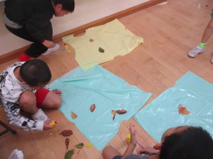 葉っぱを並べていろいろな模様をつくったり、赤い葉っぱをくりぬいて口を作ったりと、思い思いに制作しています。