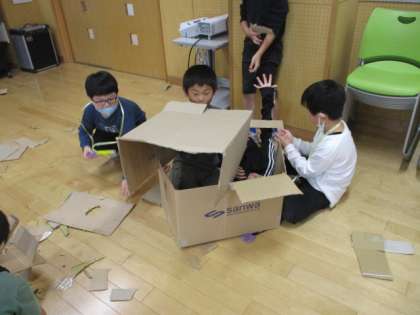 3年 段ボール クミクミックス 公開日 2023/11/10 更新日 2023/11/10 3年 段ボールカッターを使って段ボールを切り分け、その部品に切り込みを入れて様々な形に組むことを楽しみました。 タワーのように上に組んで友達と高さを競ったり、組んだものを手や足に身に付けて、形のかっこよさを味わったりしていました。