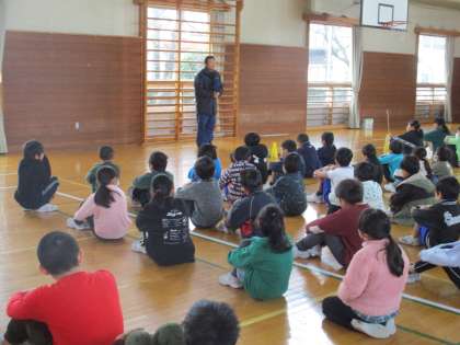 今日は、北消防署和合出張所から3名の消防士さんに来ていただき、避難訓練の様子や倉垣小学校の環境を見ていただきました。
