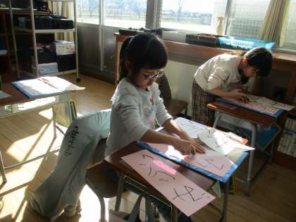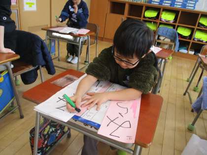小学校生活初めての書き初め大会です。 気持ちを落ち着け、丁寧な字で書きました。