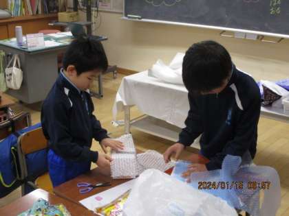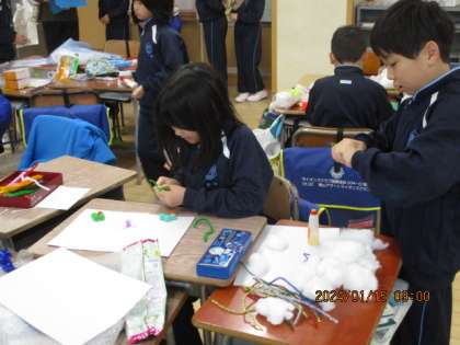 2年生が図画工作「材料からひらめいたことを絵にしよう」の学習に取り組んでいました。取り組んでいました。ビーズ、モール、おはじき、わた、毛糸、プチプチ(緩衝材)など、自分が持ってきた材料から表現したいものを決めて作品を作ります。