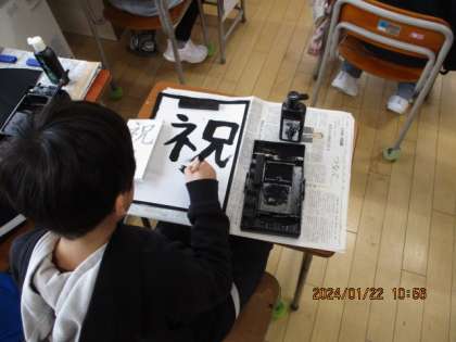 贈りたい言葉 公開日 2024/01/22 更新日 2024/01/22 学校から 4年生は書写で、6年生に送りたい言葉を習字で表しました。 「感謝」「祝」「桜」などの言葉をとても丁寧な字で書いていました。