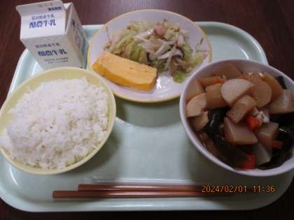 ごはん 牛乳 厚焼きたまご ベーコンとエリンギのソテー おでん