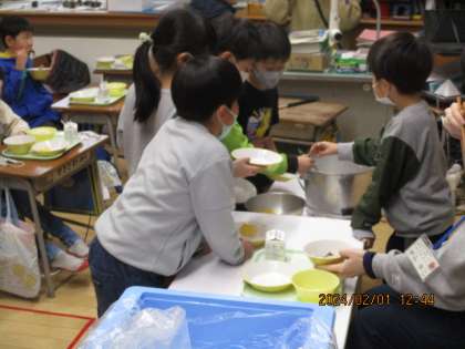 あまくてふっくらとした厚焼きたまごは、たくさんの子供たちがおかわりをしていました。1年生教室では、それでもボウルにもう少しだけ厚焼きたまごが残ってしまいました。