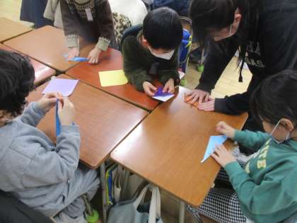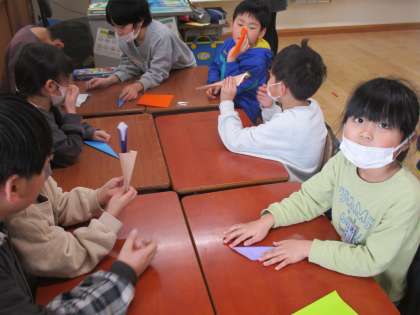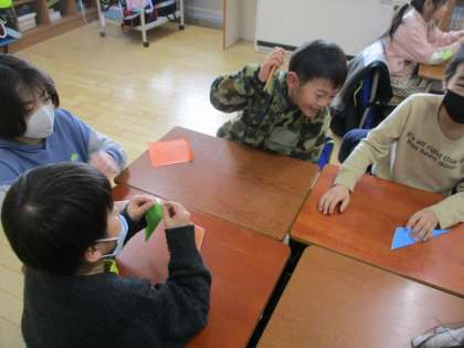 5年生のお兄さんお姉さんに優しく教えてもらいながら、一生懸命折り紙を折っていました。