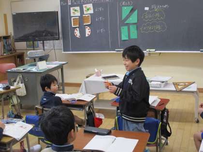 2年生が算数で分数の学習をしていました。1枚の正方形の折り紙を同じ大きさに分けたときの一つ分の大きさをどう言えばいいのかを確かめました。